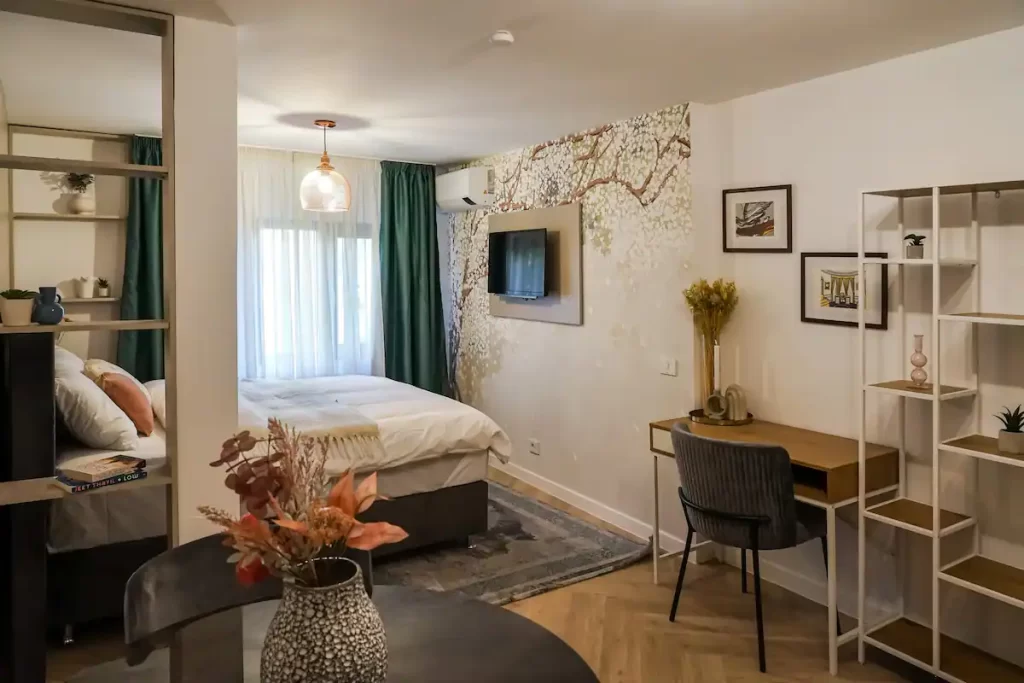 This apartment is the perfect cozy retreat. The decor is warm and inviting, with a mix of contemporary and vintage pieces that create a comfortable and relaxing atmosphere. Whether you’re here for work or play, this apartment is the perfect place to call home. You’ll love the comfortable furnishings and the peaceful ambiance that this apartment provides.